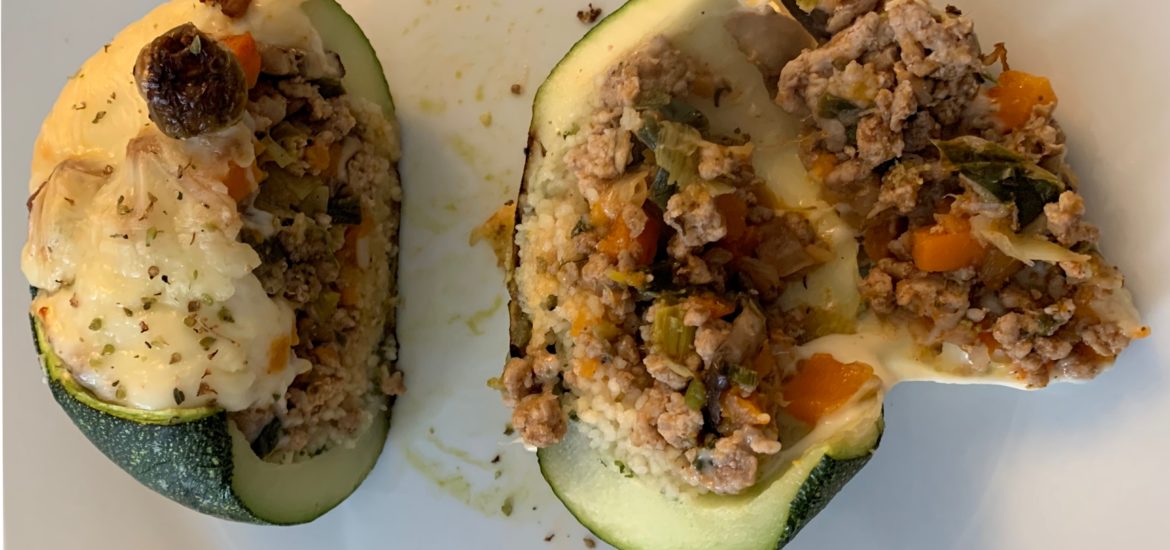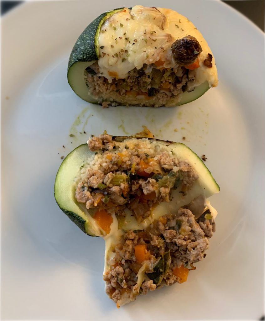 Cut a lid out of the courgette and excavate it with a spoon to form a hole. Save the flesh and freeze it to use in other recipes. Season the inner side of the courgette with salt and pepper. Pour the couscous (raw) and add the parsley. Stuff with Bolognese, press to fill all available space and cover with the cheese. Bake at 200C till the cheese melts.