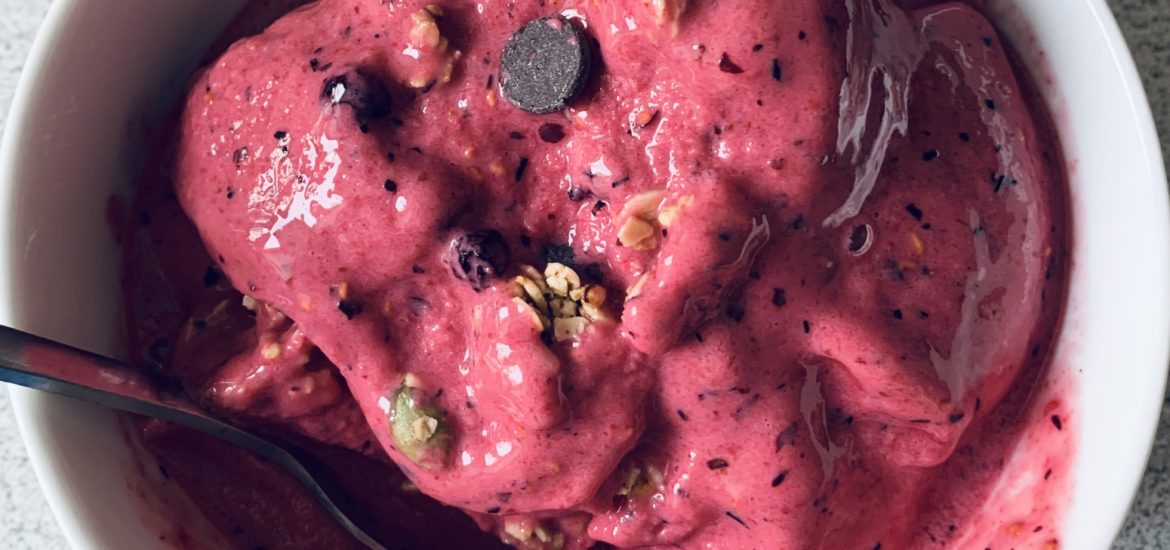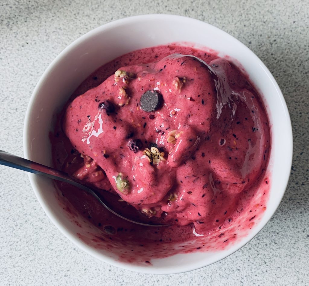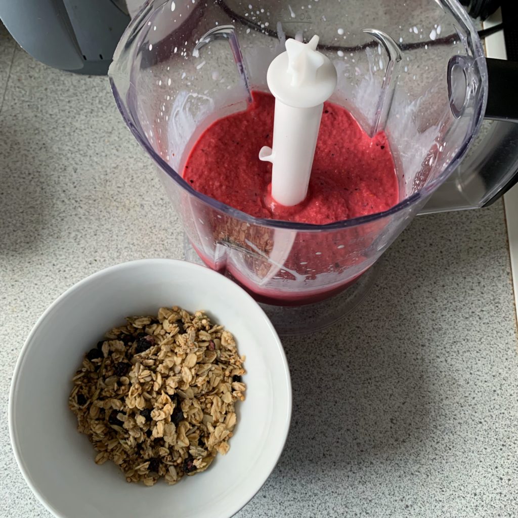 All you need is some frozen berries. I used raspberries and blueberries. Cover with some koldskål (if can’t find some just use yogurt), blend. Sprinkle with granola to add texture. I choose a granola with dark chocolate and dried blueberries.