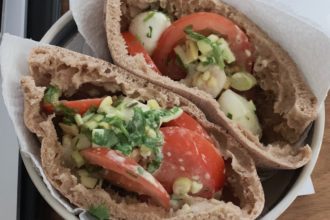 Whole meal pita bread with tomato and mozzarella filling