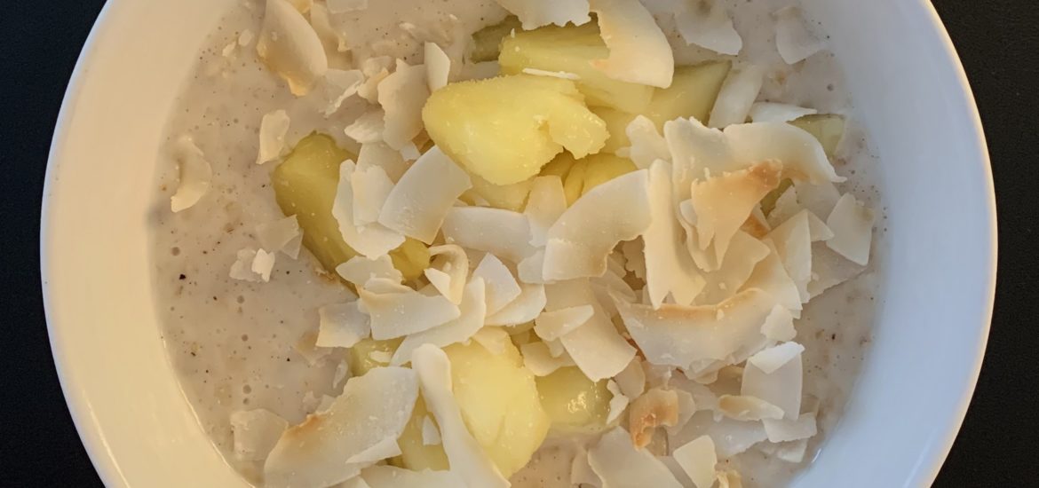 Pour them in a sauce pan, sprinkle with cinnamon and let it simmer till they are creamy. Pour in a bowl, add pineapple (frozen or fresh are good) and coconut shaves.