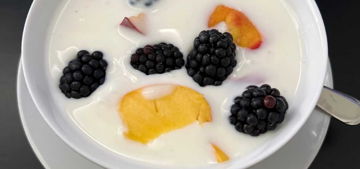 - Before serving, cut the remaining nectarine slices and scoop the chilled koldskål into bowls.