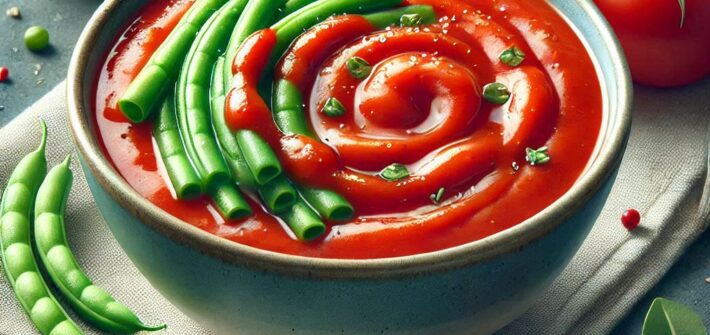 The recipe outlines a soup preparation using fresh vegetables including tomatoes, onions, potatoes, celery, carrots, and string beans. The string beans are steamed separately, while the other ingredients are cooked together in a Ninja Foodie for a creamy base. Season with salt and olive oil to taste before blending.