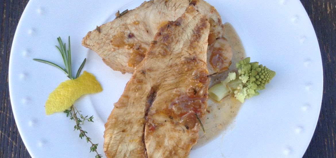 - Marinade the turkey breast for 2-3 hours in balsamic vinegar, rosemary, thyme, orange slices, lemon zest, ginger, garlic and paprika.